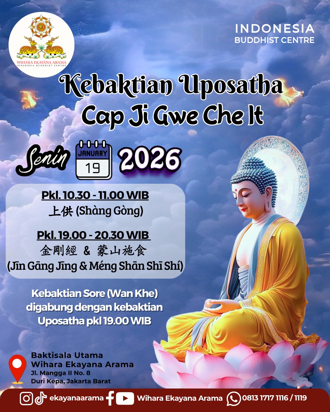 Kebaktian Uposatha - Cap Ji Gwe Che It - Senin, 19 Jan 2026Senin, 19 Januari 2026 10:30 - Senin, 19 Januari 2026 20:30